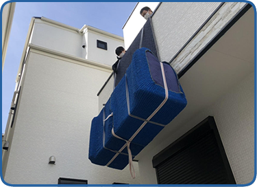 階段や廊下、玄関を通らない大型家具・家電を当社の専門スタッフが吊り上げ、吊り下げで搬入、搬出いたします。