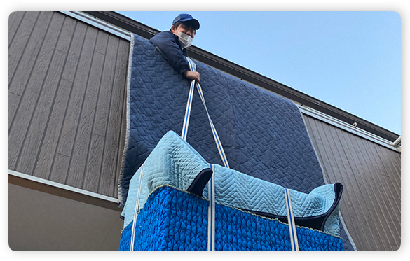 ベランダ等から手吊り作業、もしくはクレーン車による吊上げ作業にて対応いたします。また金額・予算にも柔軟に対応致します。お気軽にご相談ください。
