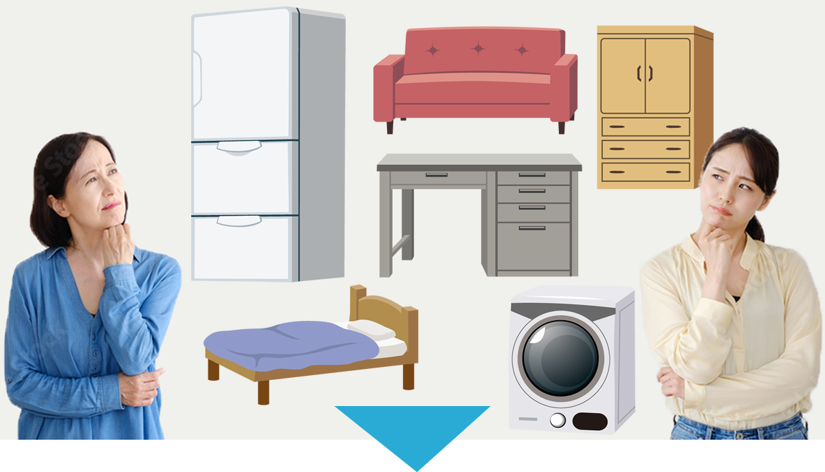 ソファ・ベット・マットレス・本棚・箪笥(タンス)・食器棚・学習机・テレビ台・クローゼット・食卓テーブル・冷蔵庫・洗濯機